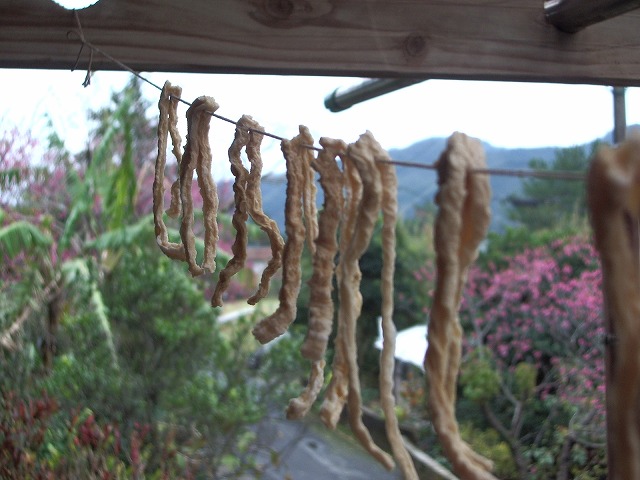 いつまでたってもしっとり湿ったままで、取込むタイミングを図りかねていましたが、さらに1週間雨だというのであきらめて収穫しました。これで大根1本分。お店で売っているものよりちょっと太い仕上がり。
